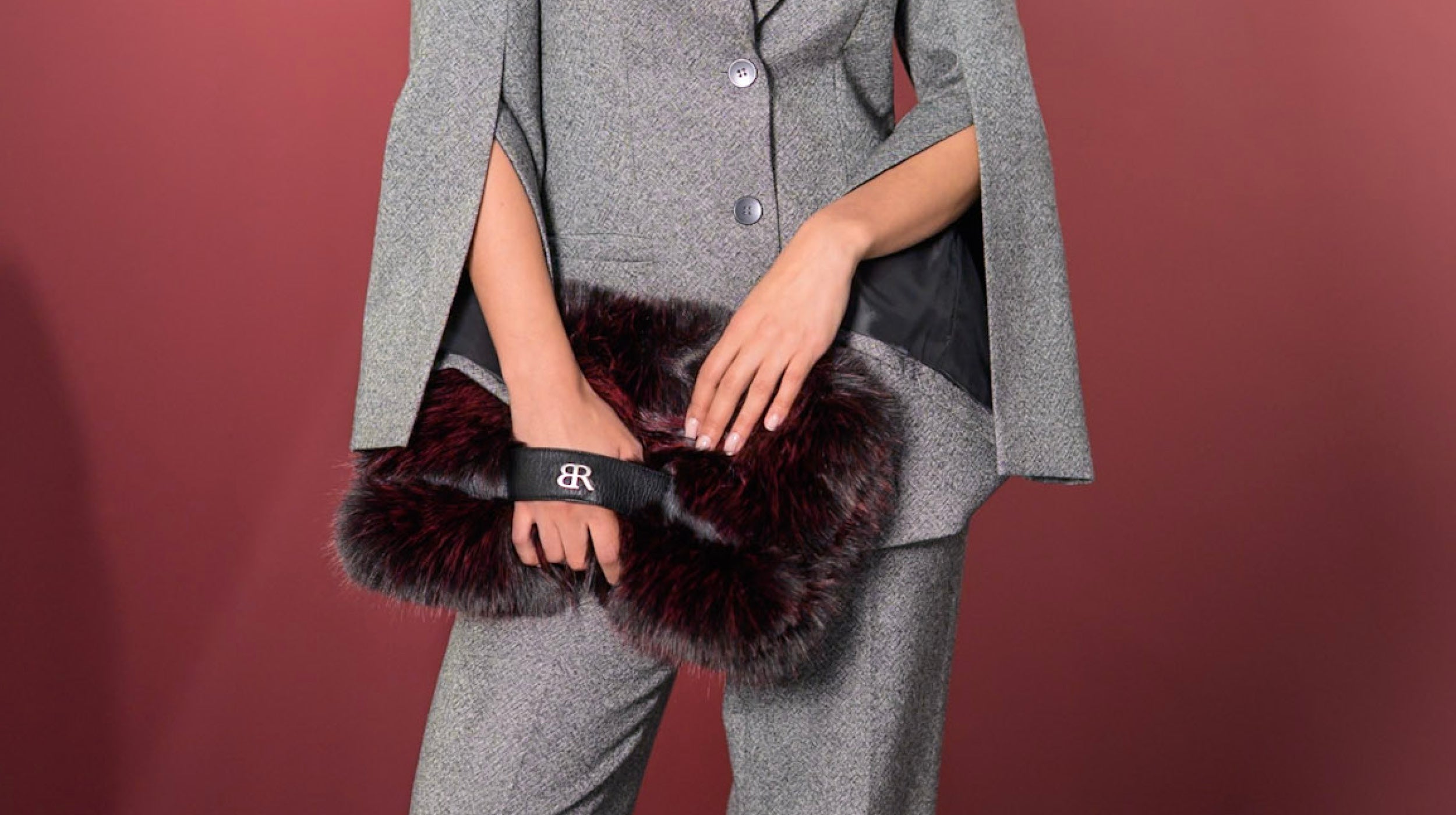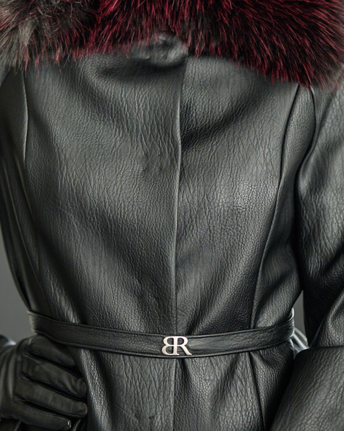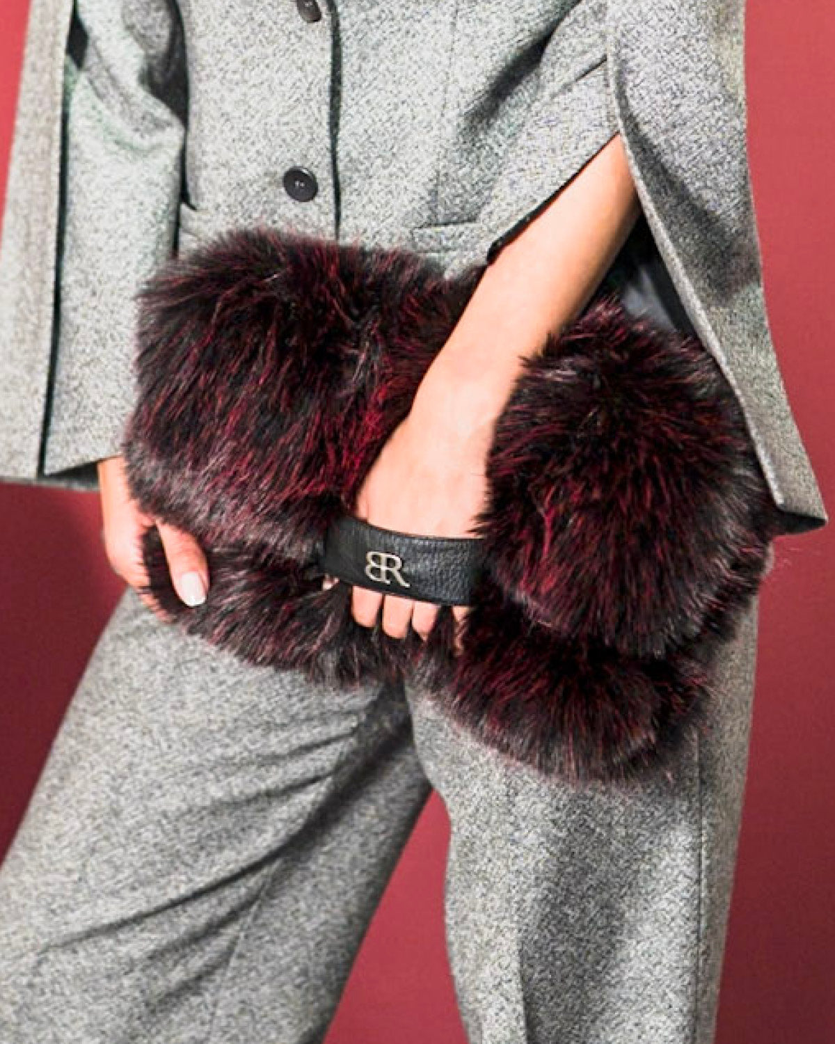 VALENCIA, aus softem Faux Fur in Bordeaux, kombiniert mit schwarzem veganem Leder.