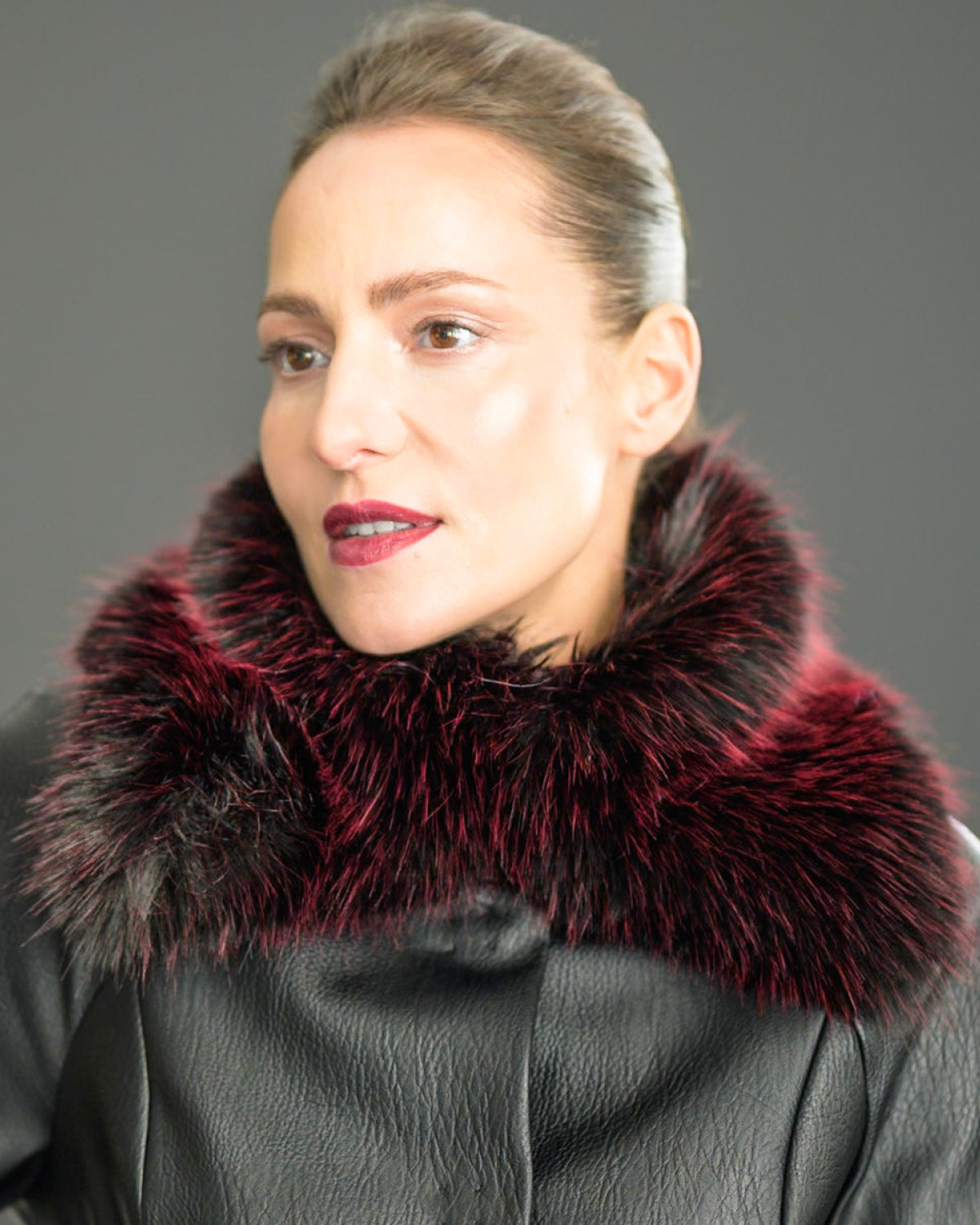 Weicher Faux Fur Kragen in Bordeaux, clean geschnitten, als Akzent zu veganem Leder oder Wollstoffen.
